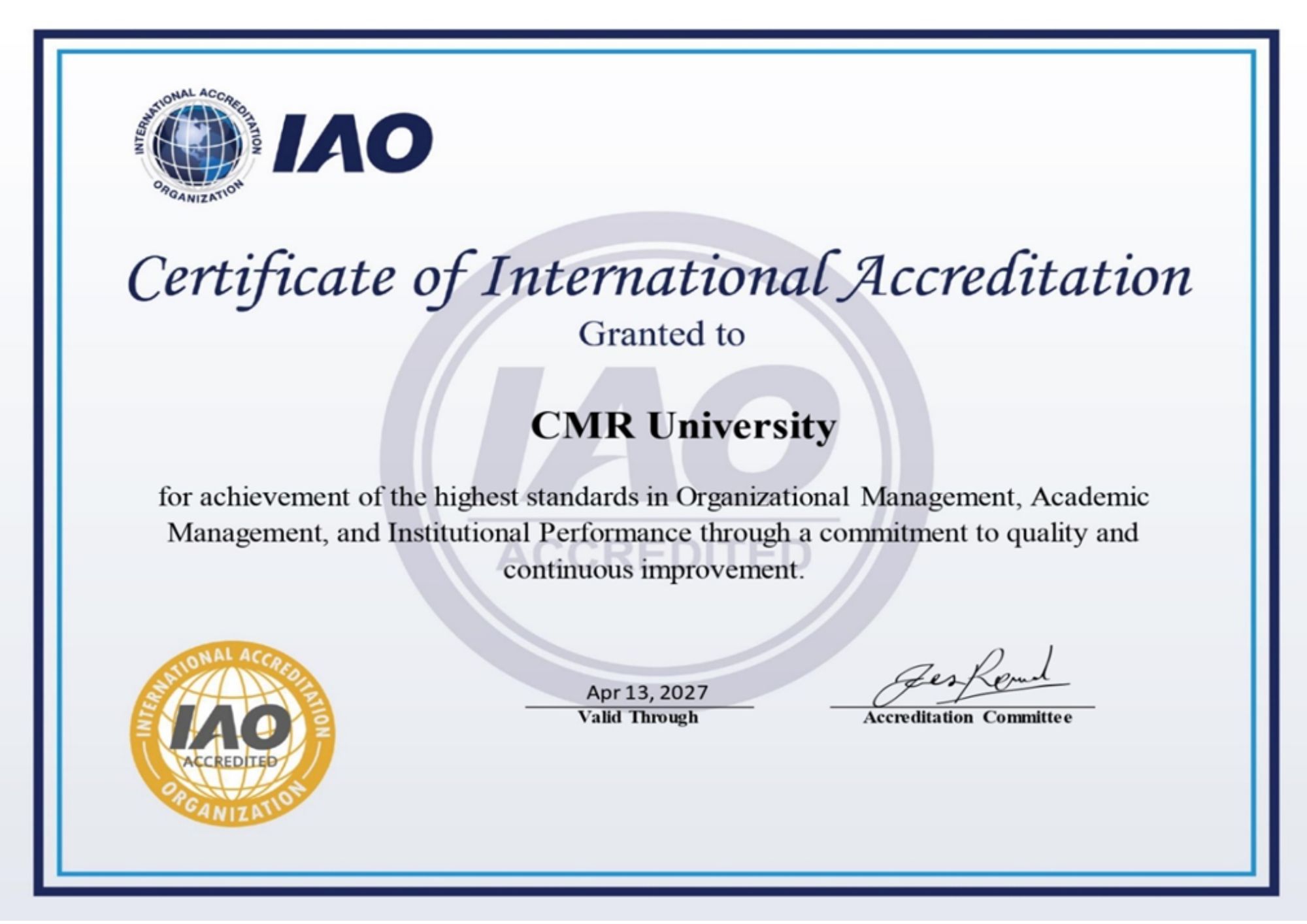 CMR University has received certification for Perfect Work Place for women Certification and Five Star Place to Work Certification from Artificial Intelligence Registration and Certification Limited for the year 2022, ISO Certified 22000-2018 Food Safety Management, ISO 9001-2015 Quality Management System Certification, ISO / IEC 27001: 2013 Information Security Management System Certification, ISO 14001: 2015 Environment Management System Certification from Veritas Assurance International, Kemp House, 160 City Road, London, the United Kingdom for the year 2022, International Accreditation till the Year 2027(Full Accreditation) from International Accreditation Organization, 10685-B, Hazelhurst Dr. # 11524, Huston, TX 77043, USA, for the year 2022, Workplace Assessment for Safety and Hygiene (WASH)- Certification from Quality Council of India, IR Class Systems and Solutions Pvt Ltd for the year 2022.