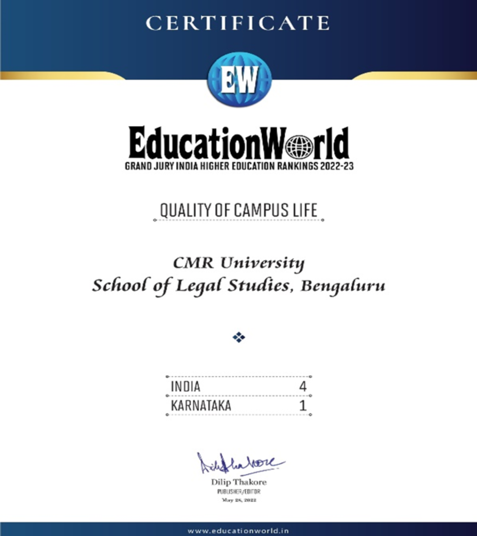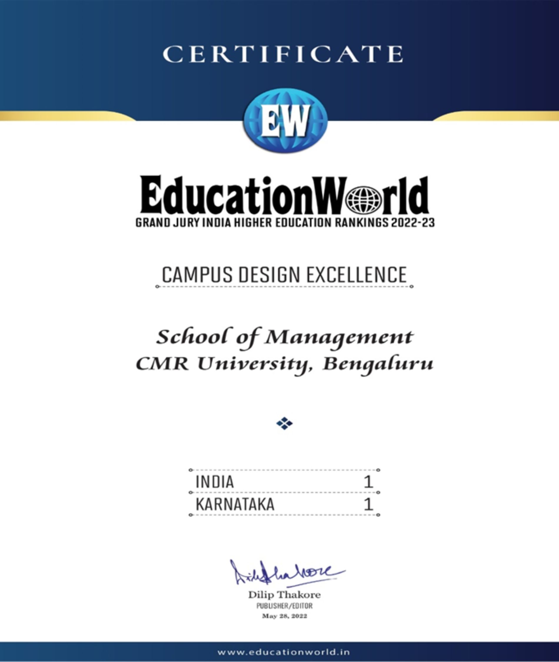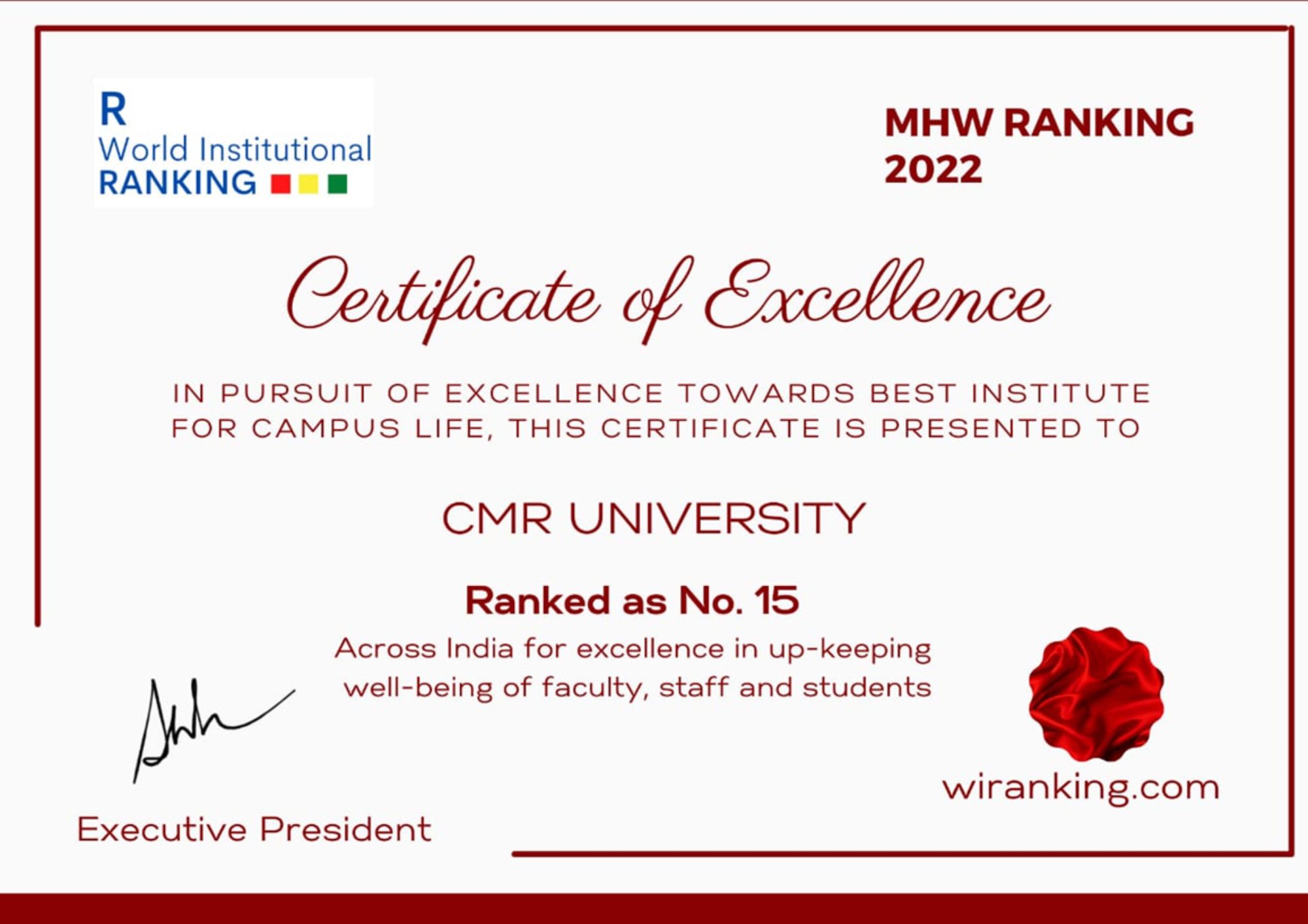 CMR University has been ranked as India’s Top LAW College 2021 from OutLook for the year 2021, The Green Institutional Ranking – 10th Rank- Sustainable Institution of India -2022 , The Global Impact Ranking – 40 th Rank- Institute of Excellence from rom R. World Institutional Ranking, Carnival House, Malad East, Mumbai (IN) for the year 2022, University of Eminence & Best Place to Work- Deemed & Private University Category , State Private University All India Rank- 15 (OVERAll) , State Private University State Rank- 6th , State Private University South Zone Rank- 6th from Indian Institutional Ranking Framework (IIRF), India for the year 2022, All India Level – 40 th RankEW INDIA HIGHER EDUCATION RANKING 2022-23 , All India – State Level – 8 th Rank EW INDIA HIGHER EDUCATION RANKING 2022-23 from Education World, Campus Design Excellence, School of Management , CMR University, Bangalore – All India – National Level – 1st Rank and State Level – 1st Rank, State Level – 1st Rank , Karnataka from Education World, All India – National Level – 3rd Rank , All India – National Level – 4th Rank from Education World, Quality of Campus Life, School of Legal Studies, CMRU, Banaglore, State Level – 1st Rank , Karnataka , MHW Ranking, Best Institue for Campus Life – All India National level Rank 15 from R. World Institutional Ranking, Emerging Engineering Institutes – Placement 2022 – All India level 3rd Rank , Emerging Engineering Institutes- Research Capability – All India level 3rd Rank , Top Emerging Engineering, Institutes in the Country – All India level 4th Rank from Times Engineering, School of Economics and Commerce,CMR University, Bengaluru – All India Rank – 129, School of Legal Studies,CMR University, Bengaluru – All India Rank – 26, School of Management,CMR University, Bengaluru – All India Rank – 171, School of Science Studies, CMR University, Bengaluru – All India Rank – 138 from India – Survey by India Today – Magazine – July-2022, CMR University rated as India’s most admired University of the year 2022 – The Knowledge Review Magazine